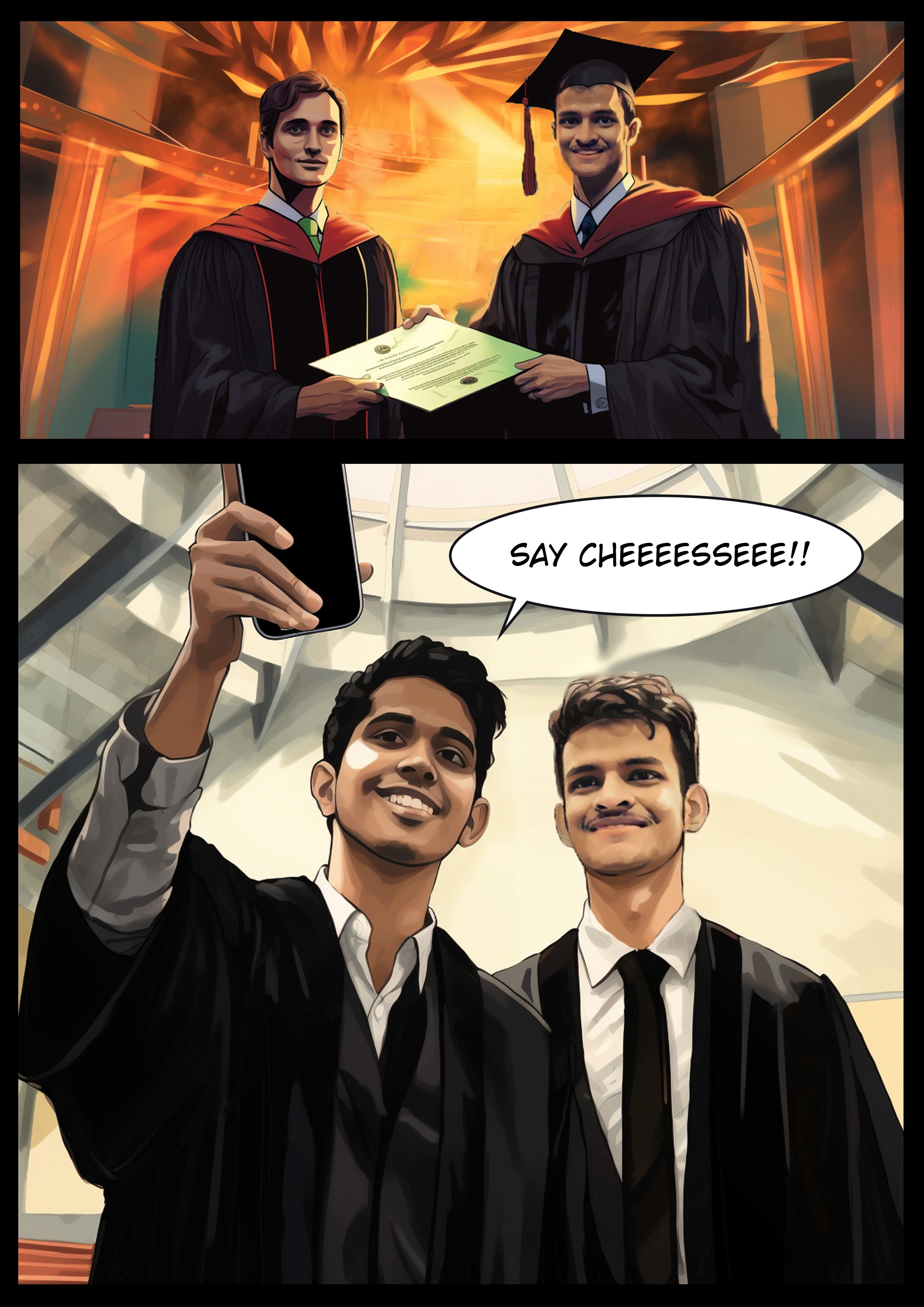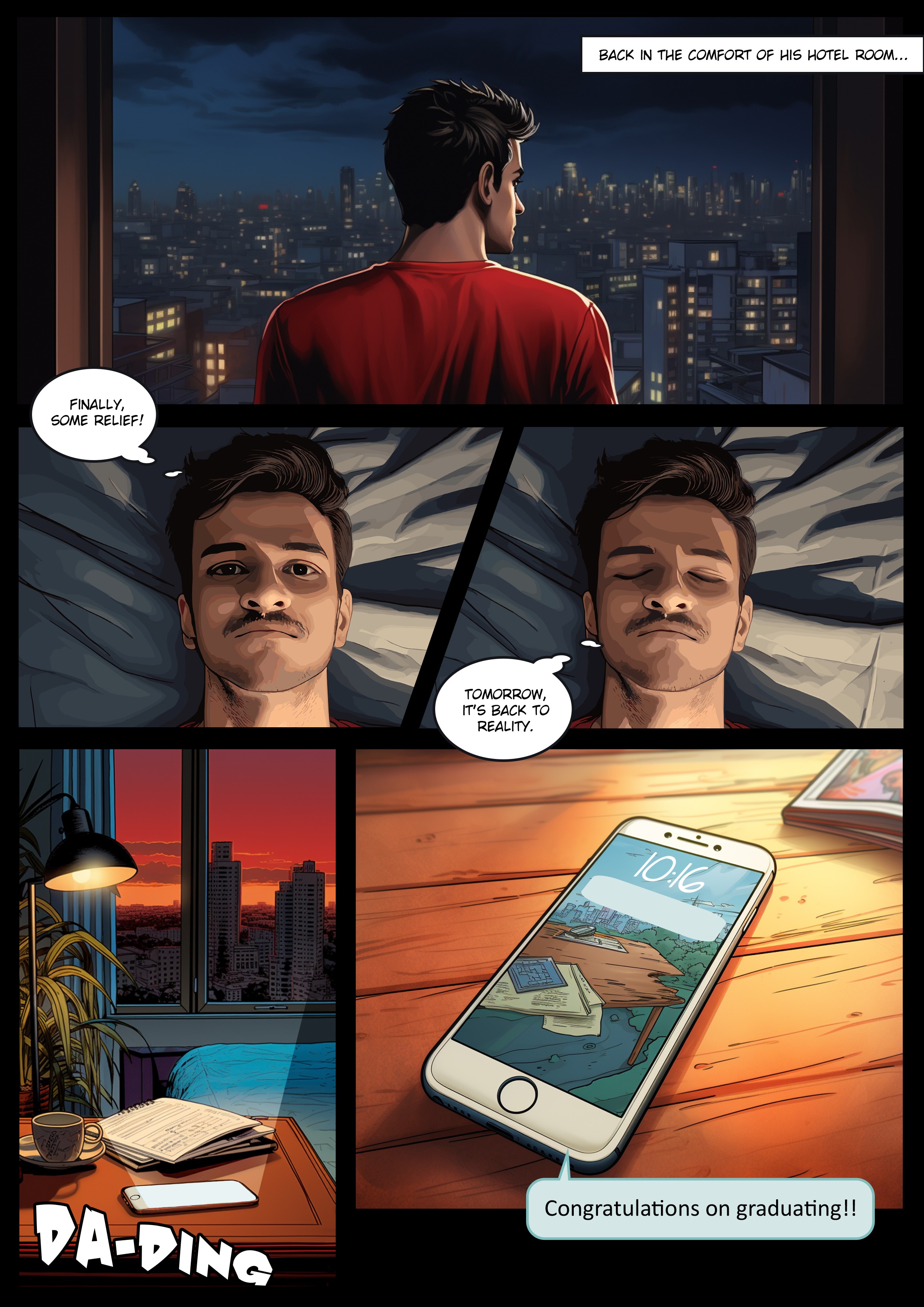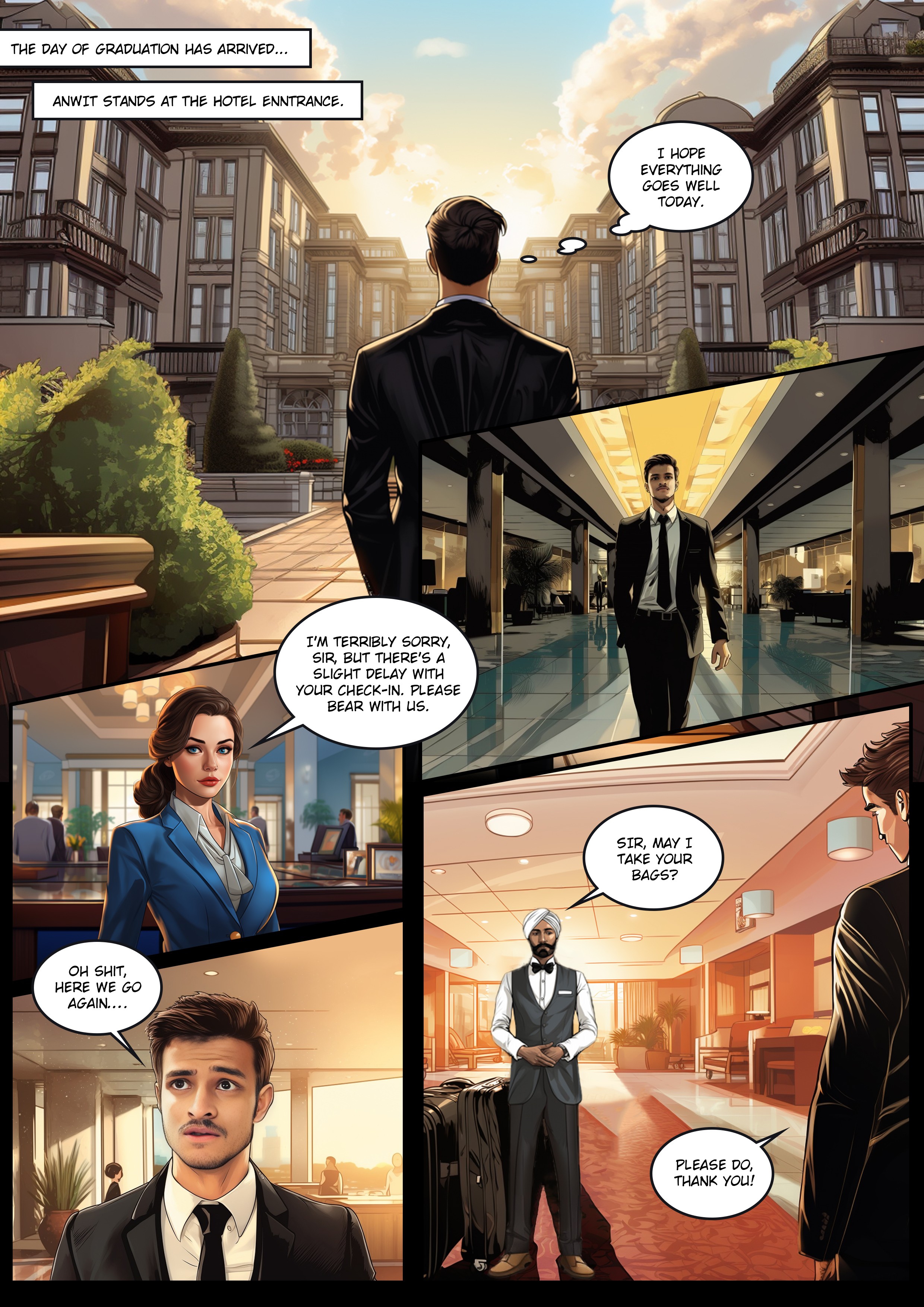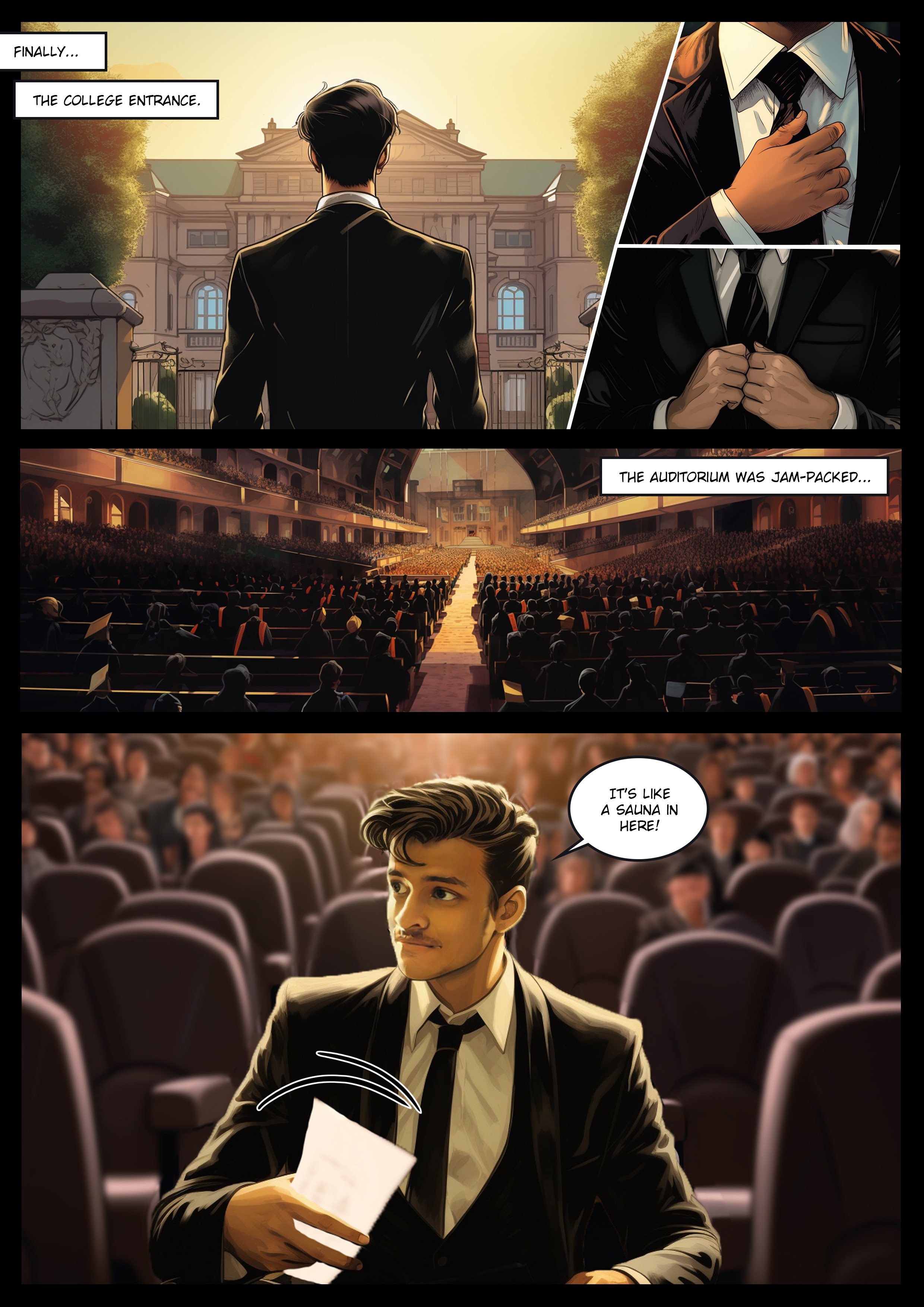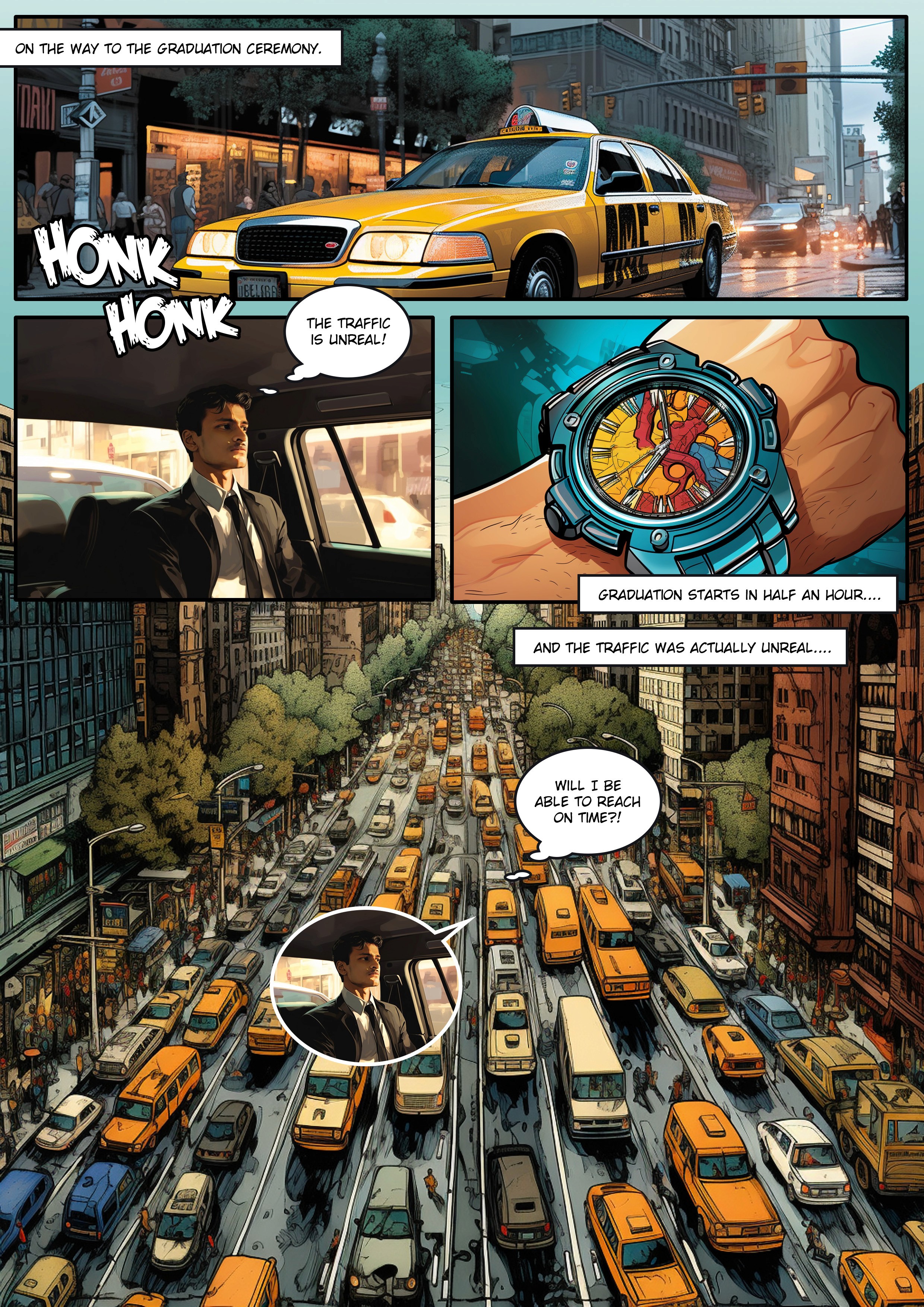 Join me, a recent college graduate, on a thrilling journey to his convocation. With a delayed hotel check-in, traffic jams, and a sweltering auditorium, he and his friends navigate challenges, making this comic a story of perseverance and triumph.
